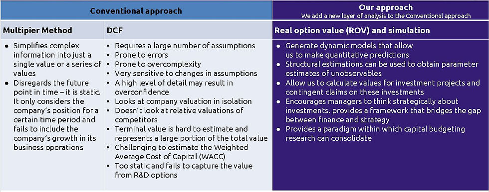 This may be new for a lot of people, due to the fact that these methodologies are not currently being used because most people think it is too difficult or the information asymmetry makes it impossible to apply. The good news is that our methodology gives you better results in situations where there's a high level of uncertainty. Just to mention an example, intangible assets in life science companies tend to be a huge part of the actual value and they can only be assessed using our methods.